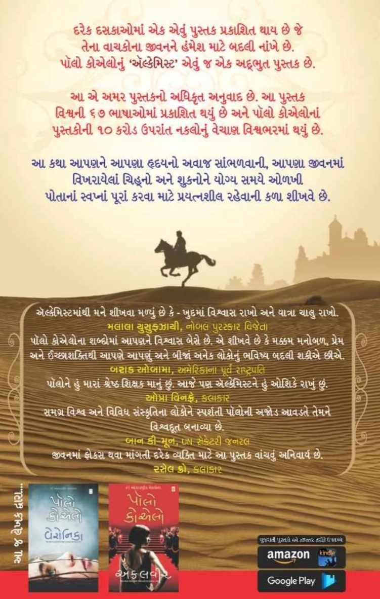 આ એ અમર પુસ્તકનો અધિકૃત અનુવાદ છે. આ પુસ્તક વિશ્વની 67 ભાષાઓમાં પ્રકાશિત થયું છે અને પૉલો કોએલોનાં પુસ્તકોની 10 કરોડ ઉપરાંત નકલોનું વેચાણ વિશ્વભરમાં થયેલું છે.