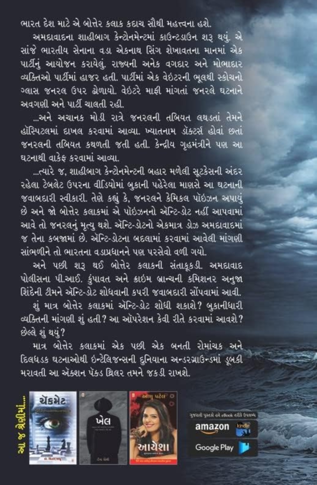 ...ત્યારે જ, શાહીબાગ કેન્ટોનમેન્ટની બહાર મળેલી સૂટકેસની અંદર રહેલા ટેબલેટ ઉપરના વીડિયોમાં બુકાની પહેરેલા માણસે આ ઘટનાની જવાબદારી સ્વીકારી. તેણે કહ્યું કે, જનરલને કેમિકલ પૉઇઝન અપાયું છે અને જો બોત્તેર કલાકમાં એ પૉઇઝનનો ઍન્ટિ-ડોટ નહીં આપવામાં આવે તો જનરલનું મૃત્યુ થશે. ઍન્ટિ-ડોટનો એકમાત્ર ડોઝ અમદાવાદમાં જ તેના કબજામાં છે. ઍન્ટિ-ડોટના બદલામાં કરવામાં આવેલી માંગણી સાંભળીને તો ભારતના વડાપ્રધાનને પણ પરસેવો વળી ગયો.