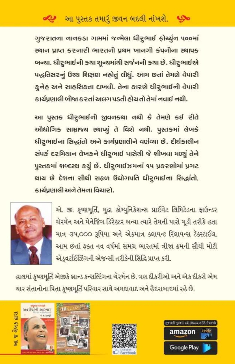 ગુજરાતના નાનકડા ગામમાં જન્મેલા ધીરુભાઈ ફોર્ચ્યુન ૫૦૦માં સ્થાન પ્રાપ્ત કરનારી ભારતની પ્રથમ ખાનગી કંપનીના સ્થાપક બન્યા. ધીરુભાઈની કથા શૂન્યમાંથી સર્જનની કથા છે. ધીરુભાઈએ પદ્ધતિસરનું ઉચ્ચ શિક્ષણ નહોતું લીધું. આમ છતાં તેમણે વેપારી કુનેહ અને સાહસિકતા દાખવી. તેના કારણે ધીરુભાઈની વેપારી કાર્યપ્રણાલી બીજા કરતાં અલગ પડતી હોય તો તેમાં નવાઈ નથી.