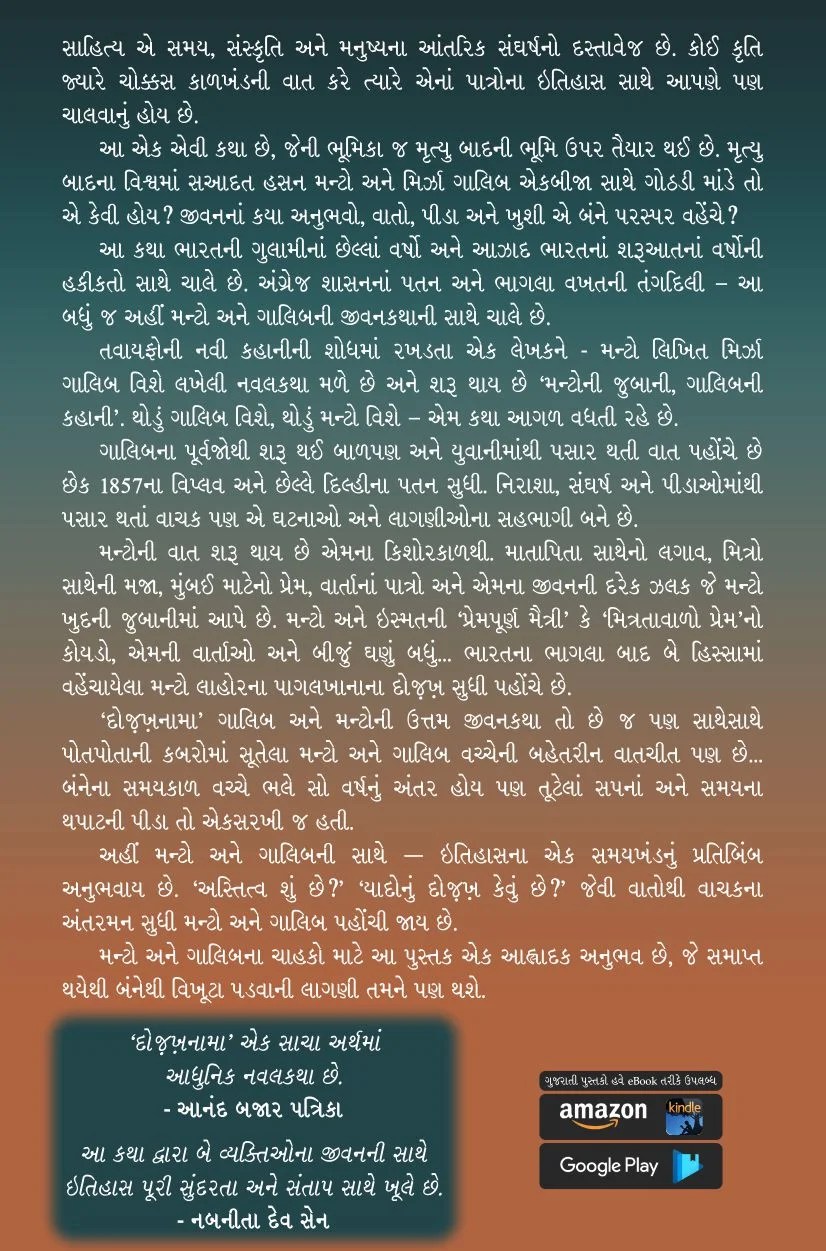 દોજખનામા ગાલિબ અને મન્ટોની ઉત્તમ જીવનકથા તો છે જ પણ સાથેસાથે પોતપોતાની કબરોમાં સૂતેલા મન્ટો અને ગાલિબ વચ્ચેની બહેતરીન વાતચીત પણ છે…. બંનેના સમયકાળ વચ્ચે ભલે સો વર્ષનું અંતર હોય પણ તૂટેલાં સપનાં અને સમયના થપાટની પીડા તો એકસરખી જ હતી.