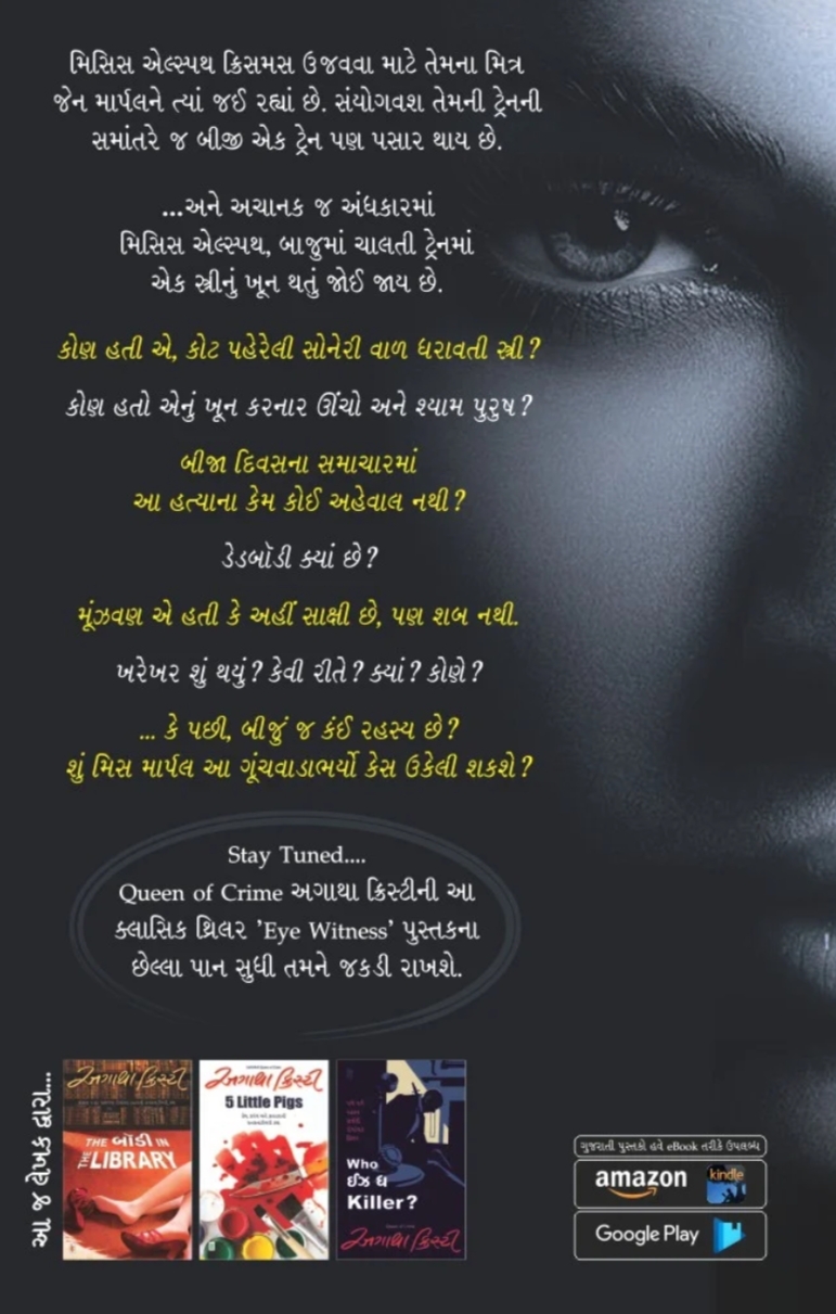 … કે પછી, બીજું જ કંઈ રહસ્ય છે? શું મિસ માર્પલ આ ગૂંચવાડાભર્યો કેસ ઉકેલી શકશે? Stay Tuned…. Queen of Crime અગાથા ક્રિસ્ટીની આ ક્લાસિક થ્રિલર ‘Eye Witness’ પુસ્તકના છેલ્લા પાન સુધી તમને જકડી રાખશે.