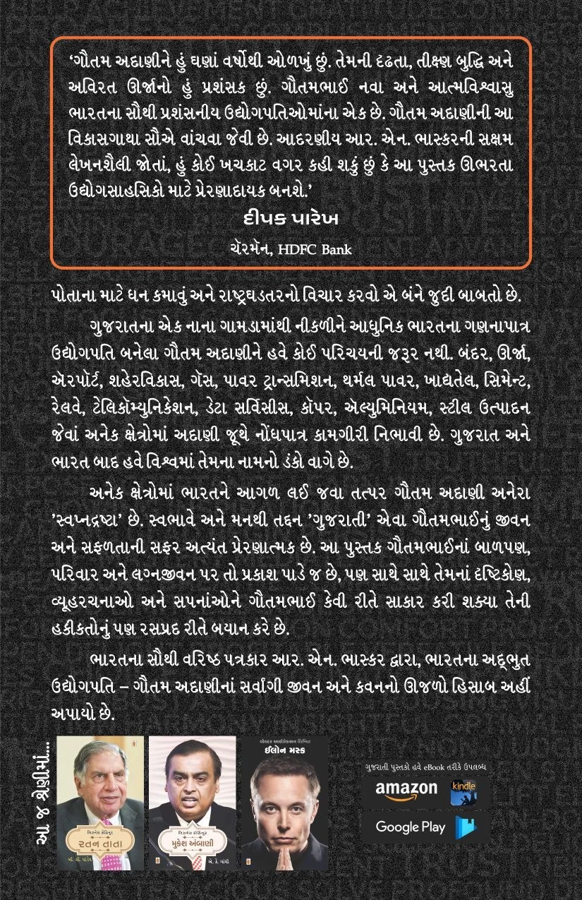 અનેક ક્ષેત્રોમાં ભારતને આગળ લઈ જવા તત્પર ગૌતમ અદાણી અનેરા ‘સ્વપ્નદ્રષ્ટા’ છે. સ્વભાવે અને મનથી તદ્દન ‘ગુજરાતી’ એવા ગૌતમભાઈનું જીવન અને સફળતાની સફર અત્યંત પ્રેરણાત્મક છે. આ પુસ્તક ગૌતમભાઈનાં બાળપણ, પરિવાર અને લગ્નજીવન પર તો પ્રકાશ પાડે જ છે, પણ સાથે સાથે તેમનાં દૃષ્ટિકોણ, વ્યૂહરચનાઓ અને સપનાંઓને ગૌતમભાઈ કેવી રીતે સાકાર કરી શક્યા તેની હકીકતોનું પણ રસપ્રદ રીતે બયાન કરે છે.
