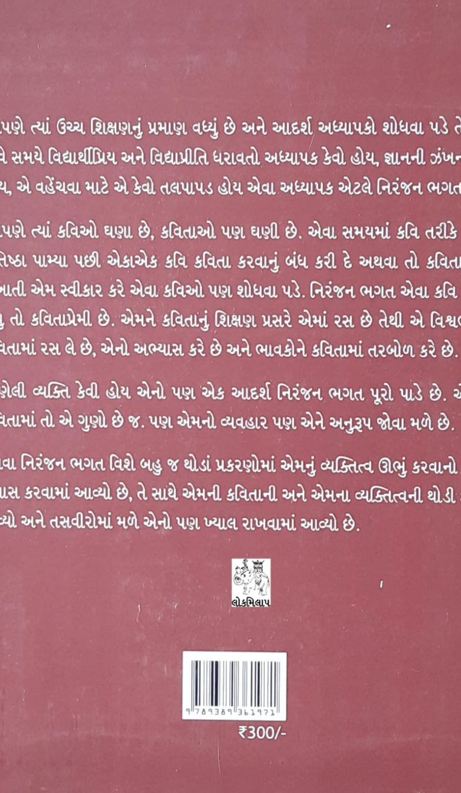 આવા નિરંજન ભગત વિશે બહુ જ થોડાં પ્રકરણોમાં એમનું વ્યક્તિત્વ ઊભું કરવાનો અહીં પ્રયાસ કરવામાં આવ્યો છે, તે સાથે એમની કવિતાની અને એમના વ્યક્તિત્વની થોડી ઝલક કાવ્યો અને તસવીરોમાં મળે એનો પણ ખ્યાલ રાખવામાં આવ્યો છે.