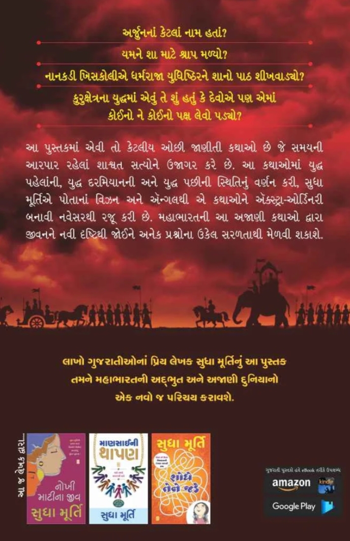 આ પુસ્તકમાં એવી તો કેટલીય ઓછી જાણીતી કથાઓ છે જે સમયની આરપાર રહેલાં શાશ્વત સત્યોને ઉજાગર કરે છે. આ કથાઓમાં યુદ્ધ પહેલાંની, યુદ્ધ દરમિયાનની અને યુદ્ધ પછીની સ્થિતિનું વર્ણન કરી, સુધા મૂર્તિએ પોતાનાં વિઝન અને ઍન્ગલથી એ કથાઓને ઍક્સ્ટ્રા-ઓર્ડિનરી બનાવી નવેસરથી રજૂ કરી છે. મહાભારતની આ અજાણી કથાઓ દ્વારા જીવનને નવી દૃષ્ટિથી જોઈને અનેક પ્રશ્નોના ઉકેલ સરળતાથી મેળવી શકાશે.