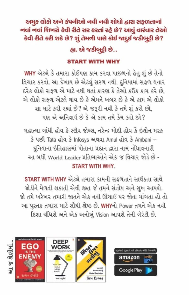 START WITH WHY એટલે તમારા કામની સફળતાને સાર્થકતા સાથે જોડીને મેળવી શકાતી એવી જીત જે તમને સંતોષ અને સુખ આપશે. જો તમે ખરેખર તમારી જાતને એક નવી ઊંચાઈ પર જોવા માંગતા હો તો આ પુસ્તક તમારા માટે સૌથી શ્રેષ્ઠ છે. WHYનો Power તમને એક નવી દિશા ચીંધશે અને એક અનોખું Vision આપશે તેની ગૅરંટી છે.