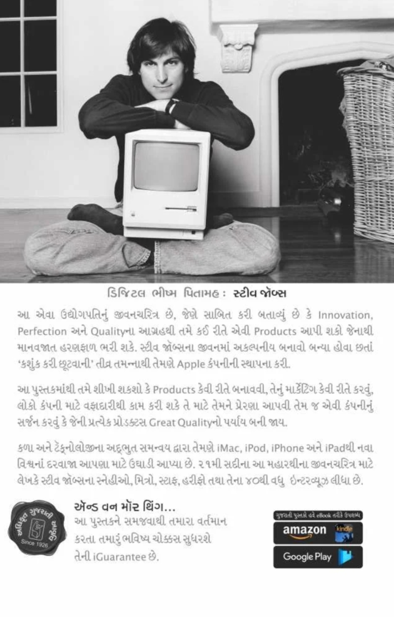 આ એવા ઉદ્યોગપતિનું જીવનચરિત્ર છે, જેણે સાબિત કરી બતાવ્યું છે કે Innovation, Perfection અને Qualityના આગ્રહથી તમે કઈ રીતે એવી Products આપી શકો જેનાથી માનવજાત હરણફાળ ભરી શકે. સ્ટીવ જૉબ્સના જીવનમાં અકલ્પનીય બનાવો બન્યા હોવા છતાં `કશુંક કરી છૂટવાની’ તીવ્ર તમન્નાથી તેમણે Apples કંપનીની સ્થાપના કરી.