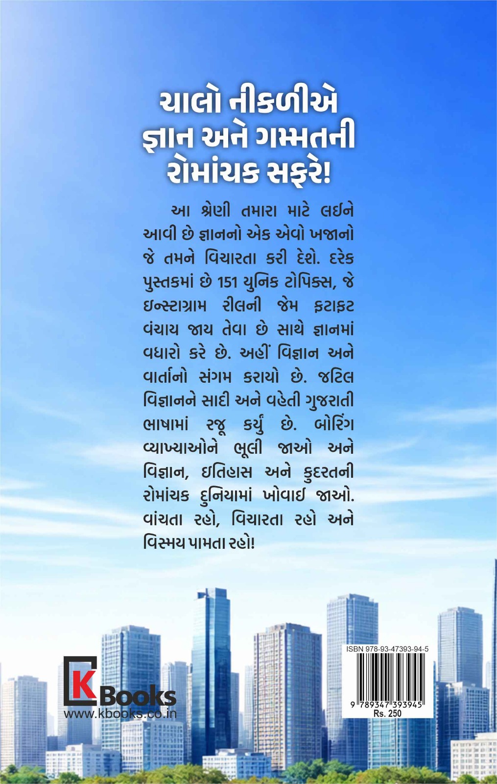આ શ્રેણી તમારા માટે લઈને આવી છે જ્ઞાનનો એક એવો ખજાનો જે તમને વિચારતા કરી દેશે. દરેક પુસ્તકમાં છે 151 યુનિક ટોપિક્સ, જે ઇન્સ્ટાગ્રામ રીલની જેમ ફટાફટ વંચાય જાય તેવા છે સાથે જ્ઞાનમાં વધારો કરે છે. અહીં વિજ્ઞાન અને વાર્તાનો સંગમ કરાયો છે. જટિલ વિજ્ઞાનને સાદી અને વહેતી ગુજરાતી ભાષામાં રજૂ કર્યું છે. બોરિંગ વ્યાખ્યાઓને ભૂલી જાઓ અને વિજ્ઞાન, ઇતિહાસ અને કુદરતની રોમાંચક દુનિયામાં ખોવાઈ જાઓ. વાંચતા રહો, વિચારતા રહો અને વિસ્મય પામતા રહો!