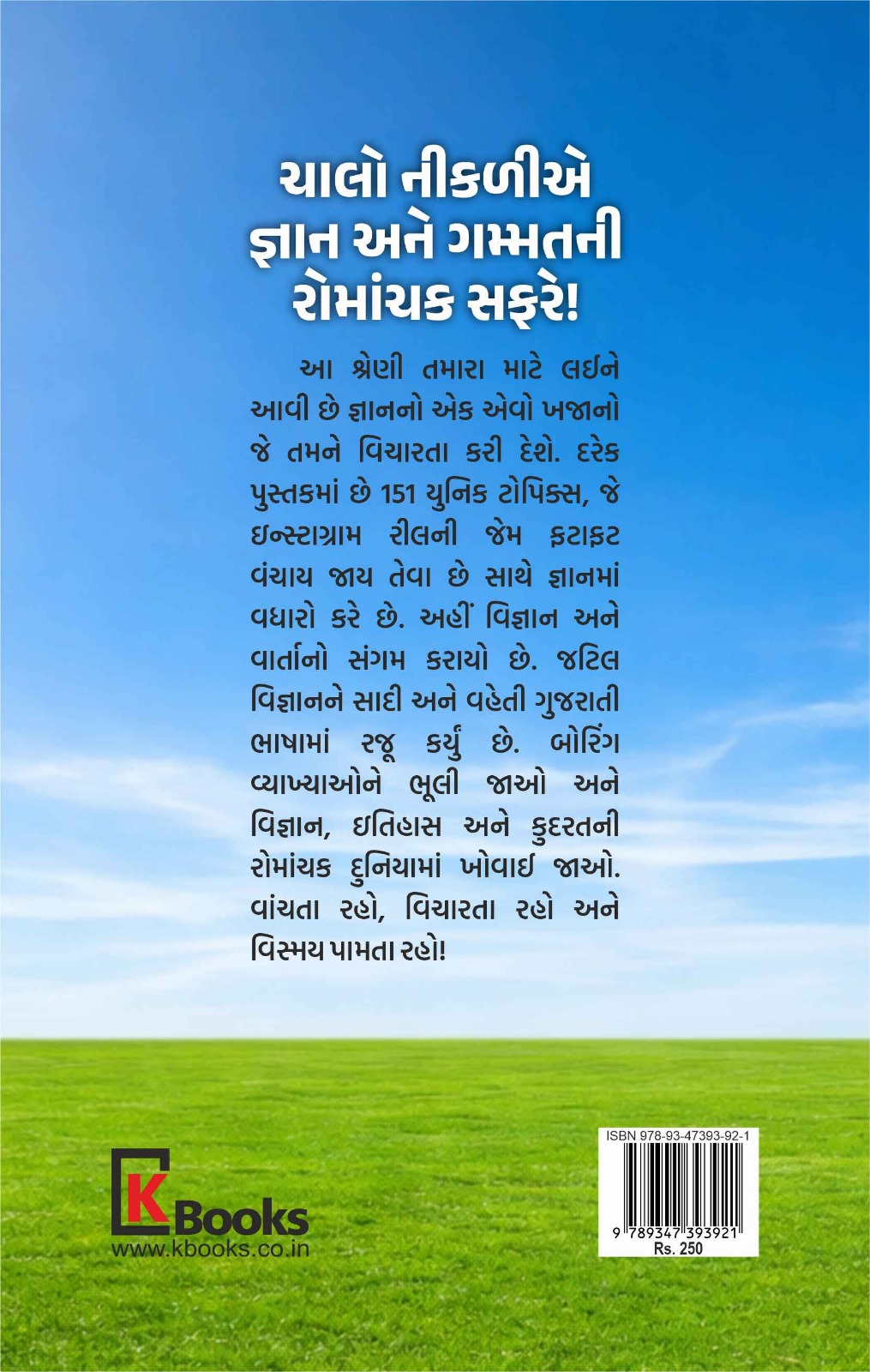 આ શ્રેણી તમારા માટે લઈને આવી છે જ્ઞાનનો એક એવો ખજાનો જે તમને વિચારતા કરી દેશે. દરેક પુસ્તકમાં છે 151 યુનિક ટોપિક્સ, જે ઇન્સ્ટાગ્રામ રીલની જેમ ફટાફટ વંચાય જાય તેવા છે સાથે જ્ઞાનમાં વધારો કરે છે. અહીં વિજ્ઞાન અને વાર્તાનો સંગમ કરાયો છે. જટિલ વિજ્ઞાનને સાદી અને વહેતી ગુજરાતી ભાષામાં રજૂ કર્યું છે. બોરિંગ વ્યાખ્યાઓને ભૂલી જાઓ અને વિજ્ઞાન, ઇતિહાસ અને કુદરતની રોમાંચક દુનિયામાં ખોવાઈ જાઓ. વાંચતા રહો, વિચારતા રહો અને વિસ્મય પામતા રહો!