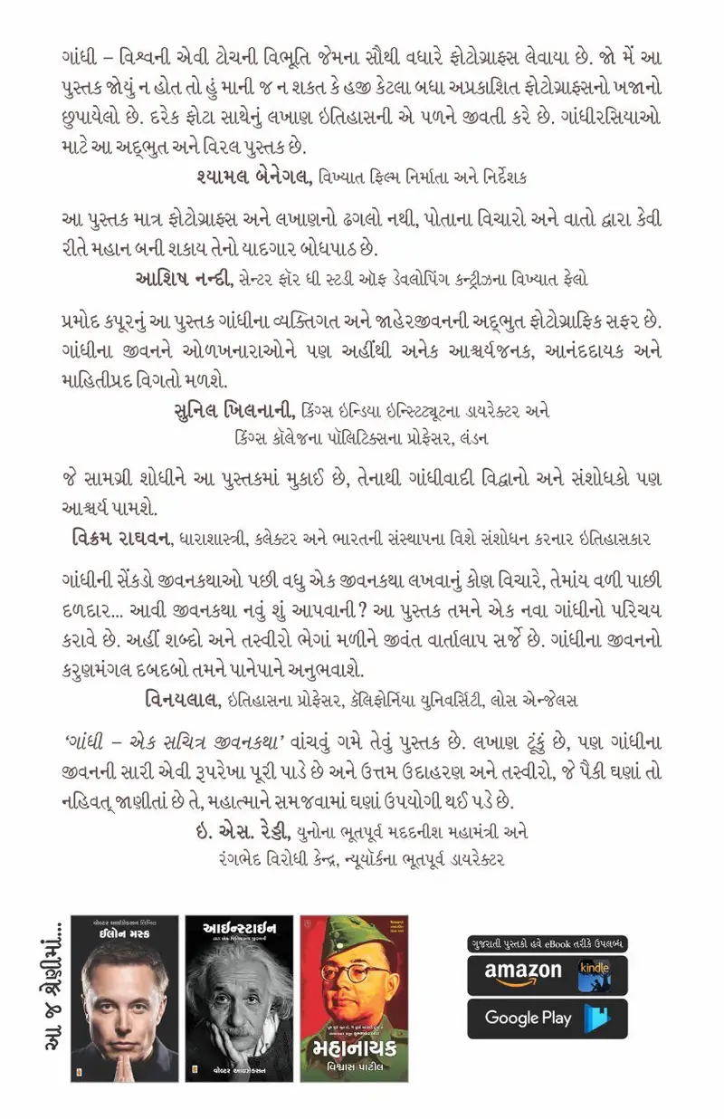 સઘન સંશોધન બાદ વિશ્વભરમાંથી મેળવેલા અસંખ્ય અને અલભ્ય ફોટોગ્રાફ્સ ગાંધીજીના સંપૂર્ણ જીવનને અહીં રસપ્રદ રીતે દર્શાવે છે. ગાંધીજીનો સ્વભાવ, તેમની નિષ્ફળતાઓ અને સફળતાઓ, તેમના સમકાલીન લોકો સાથેના ઘનિષ્ઠ સંબંધો અને પોતાના પરિવાર સાથેના મુશ્કેલ સંબંધો જેવી અનેક બાબતો ઉપર આ પુસ્તક પ્રકાશ ફેંકે છે. ભવિષ્યની પેઢીઓ માટે ગાંધીજીનાં સંદેશ અને કાર્યપદ્ધતિને સમજવા આ પુસ્તક ઉપયોગી બનશે.