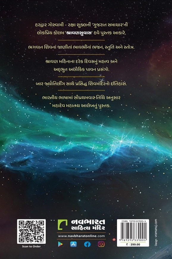 મનમાં ભરીને જીવે તે જીવ અને મન ભરીને જીવે તે શિવ... શિવ એટલે કલ્યાણ અને કલ્યાણકારી દરેક પ્રવૃત્તિ શિવ સ્વરૂપ છે. ‘ગુજરાત સમાચાર’ ધારાવાહિક સ્વરૂપે પ્રગટ થયેલી શ્રેણી હવે પુસ્તક આકારે. શ્રાવણ માસ નિમિત્તે સંશોધન અને શાસ્ત્ર આધારિત ‘અધિક શ્રાવણસુવાસ’ પુસ્તક. ગુજરાતી ભાષાના સુપ્રસિદ્ધ કવિ હરદ્વાર ગોસ્વામી અને રક્ષા શુક્લની કલમે આલેખાયેલ ગ્રન્થ દરેક ભાવકના ઘરમાં અચૂક સ્થાન પામે એવો છે. જેમાં તિથિ પ્રમાણે પ્રસંગકથા અને શ્રાવણ મહિનાના સંદર્ભે શિવકથાઓ છે. ૨૦૦થી પણ વધુ પૃષ્ઠોમાં વહેતી અલૌકિક આલમની વાતો. આલા દરજ્જાનું પ્રોડક્શન. સુખ્યાત ચિત્રકાર વી. રામાનુજની ટીમે આખું પુસ્તક સચિત્ર ડિઝાઈન કર્યું છે. ભાવભીનાં ભજન સાથે બાર જ્યોર્તિંગલિંગ સાથે પ્રસિદ્ધ શિવમંદિરનો ઈતિહાસ... તિથિ મુજબ મહાદેવ મહાત્મ્ય આલેખતું ભારતીય ભાષાનું આ પ્રથમ પુસ્તક છે.