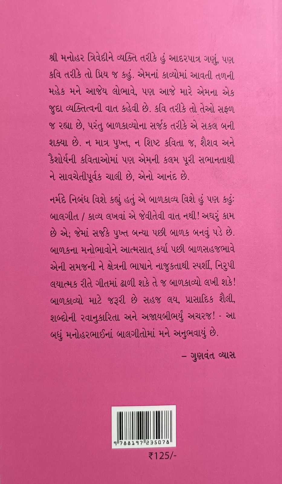 શ્રી મનોહર ત્રિવેદીને વ્યક્તિ તરીકે હું આદરપાત્ર ગણું, પણ કવિ તરીકે તો પ્રિય જ કહું. એમનાં કાવ્યોમાં આવતી તળની મહેક મને આજેય લોભાવે, પણ આજે મારે એમના એક જુદા વ્યક્તિત્વની વાત કહેવી છે. કવિ તરીકે તો તેઓ સફળ જ રહ્યા છે, પરંતુ બાળકાવ્યોના સર્જક તરીકે એ સકલ બની શક્યા છે. ન માત્ર પુખ્ત, ન શિષ્ટ કવિતા જ, શૈશવ અને કૈશોર્યની કવિતાઓમાં પણ એમની કલમ પૂરી સભાનતાથી ને સાવચેતીપૂર્વક ચાલી છે, એનો આનંદ છે.