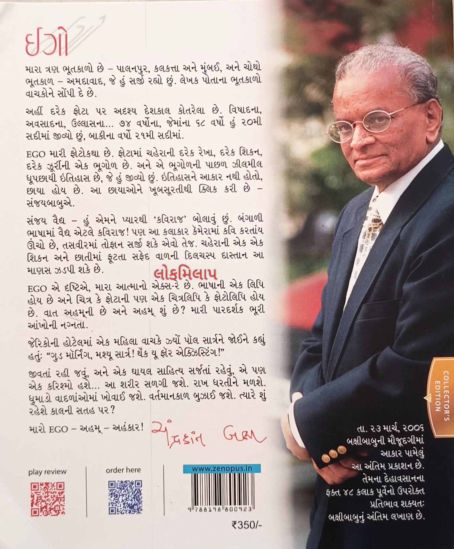જાણીતા તસવીરકાર અને સંપાદક સંજય વૈદ્ય દ્વારા સંપાદિત અને લોકચાહના પામેલી ઈ-સિરીઝનું આ પુસ્તક ચંદ્રકાંત બક્ષીના ઈગોનો જાણે ઑલ્ટર ઈગો છે. પાલનપુરમાં જન્મી કોલકાતામાં રહી ગુજરાતી સાહિત્ય વિપુલ સર્જન કરનાર બક્ષીબાબુનું સાહિત્ય એટલે સત્યનો આયનો. જિંદગી-મૃત્યુ, સ્ત્રી-પુરુષ, પ્રેમ, સમાજ, પૉલિટિક્સ, ધર્મ, ઈશ્વર જેવા અનેક વિષયો પર બક્ષીબાબુની કલમે વિના કોઈ સંકોચ કે દંભ પોતાના તીખા છતાં સર્વસ્વીકાર્ય વિચારો રજૂ કર્યા છે. તેમના તેજસ્વી, તેજાબી અને તોખારી શબ્દોએ સાહિત્યનો અનોખો માહોલ સરજ્યો અને અનેક વાચકોને તેનું વ્યસન લગાડ્યું. ધાર કાઢેલા શબ્દો હૃદયસોંસરવા ઊતરી જાય છતાં વાચક ઘાયલ હૃદયે પણ તેમના સાહિત્યને ચાહતો આવ્યો છે. વ્યાખ્યા કે વિવેચનથી પર બક્ષીબાબુના સાહિત્યે સાહિત્યના આકાશમાં ધ્રુવ તારાનું સ્થાન પ્રાપ્ત કર્યું છે અને અસંખ્ય વાચકોના હૃદયમાં આજે પણ ધબકતું રહ્યું છે. બક્ષીબાબુ હંમેશાં જેમની તસવીરોનો આગ્રહ રાખતા એવા તસવીરકાર અને સંપાદક સંજય વૈદ્ય દ્વારા તેમના સમગ્ર સાહિત્યમાંથી ઉત્તમ લેખોની પસંદગી કરી આ પુસ્તકમાં સંપાદિત કરવામાં આવ્યા છે, જેમાંથી દંતકથાસમાન લેખક બક્ષીબાબુનો મિજાજ અને ભારોભાર મસ્તી ટપકે છે. આ પુસ્તકમાં પણ દરેક લેખ સાથે મુકાયેલી ચંદ્રકાંત બક્ષીની સંજયભાઈ દ્વારા લેવાયેલી લાક્ષણિક તસવીરોમાં તેમના વિવિધ ભાવો અને મુદ્રાઓ આબાદ રીતે ઝિલાયાં છે. જાણે બક્ષી પોતે જ વાત ન કરી રહ્યા હોય! ગુજરાતી સાહિત્યના અનન્ય સર્જક ચંદ્રકાંત બક્ષીસાહેબના સર્જનને નિકટથી જાણવા અને માણવાનો મોકો આપતું આ પુસ્તક બક્ષીબાબુના આત્માનો એક્સરે છે. તેમના ચાહકો અને ગુજરાતી વાચકો માટે આ પુસ્તક એક કલેક્ટર્સ એડિશન છે.