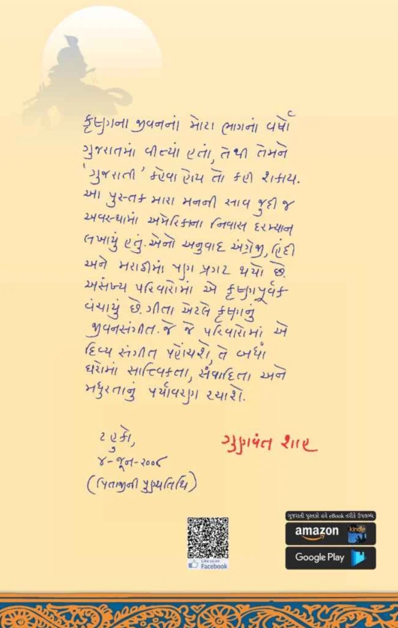 કૃષ્ણના જીવનનાં મોટા ભાગનાં વર્ષો ગુજરાતમાં વીત્યાં હતાં, તેથી તેમને `ગુજરાતી’ કહેવા હોય તો કહી શકાય. આ પુસ્તક મારા મનની સાવ જુદી જ અવસ્થામાં અમેરિકાના નિવાસ દરમ્યાન લખાયું હતું. એનો અનુવાદ અંગ્રેજી, હિંદી અને મરાઠીમાં પણ પ્રગટ થયો છે. અસંખ્ય પરિવારોમાં એ કૃષ્ણપૂર્વક વંચાયું છે. ગીતા એટલે કૃષ્ણનું જીવનસંગીત. જે જે પરિવારોમાં એ દિવ્ય સંગીત પહોંચશે, તે બધાં ઘરોમાં સાત્ત્વિકતા, સંવાદિતા અને મધુરતાનું પર્યાવરણ રચાશે.