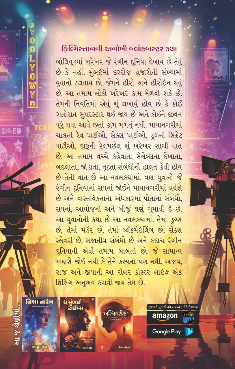 બૉલિવૂડમાં ખરેખર જે રંગીન દુનિયા દેખાય છે તેવું છે કે નહીં. મુંબઈમાં દરરોજ હજારોની સંખ્યામાં યુવાનો ઠલવાય છે, જેમને હીરો અને હીરોઇન થવું છે. આ તમામ લોકો ખરેખર કામ મેળવી શકે છે. તેમની નિયતિમાં એવું શું લખાયું હોય છે કે કોઈ રાતોરાત સુપરસ્ટાર થઈ જાય છે અને કોઈને જીવન પૂરું થવા આવે છતાં કામ મળતું નથી. માયાનગરીમાં ચાલતી રેવ પાર્ટીઓ, સેક્સ પાર્ટીઓ, ડ્રગની સિક્રેટ પાર્ટીઓ, દારૂની રેલમછેલ શું ખરેખર સાચી વાત છે. આ તમામ વચ્ચે કહેવાતા સેલેબ્સના દેખાતા, બદલાતા, જોડાતા, તૂટતા સંબંધોની હાલત કેવી હોય છે તેની વાત છે આ નવલકથામાં. ત્રણ યુવાનો જે રંગીન દુનિયાનાં સપનાં જોઈને માયાનગરીમાં પ્રવેશે છે અને વાસ્તવિકતાના અંધકારમાં પોતાનાં સંબંધો, સપનાં, આયોજનો અને બીજું ઘણું ગુમાવી દે છે. આ યુવાનોની કથા છે આ નવલકથામાં. તેમાં ડ્રગ્સ છે, તેમાં મર્ડર છે, તેમાં બ્લૅકમેઇલિંગ છે, સેક્સ સ્લેવરી છે, સજાતીય સંબંધો છે અને કદાચ રંગીન દુનિયાની એવી તમામ બાબતો છે, જે સામાન્ય માણસે જોઈ નથી કે તેને કલ્પના પણ નથી. અજય, રાજ અને જીયાની આ રોલર કોસ્ટર લાઇફ એક થ્રિલિંગ અનુભવ કરાવી જાય તેમ છે.