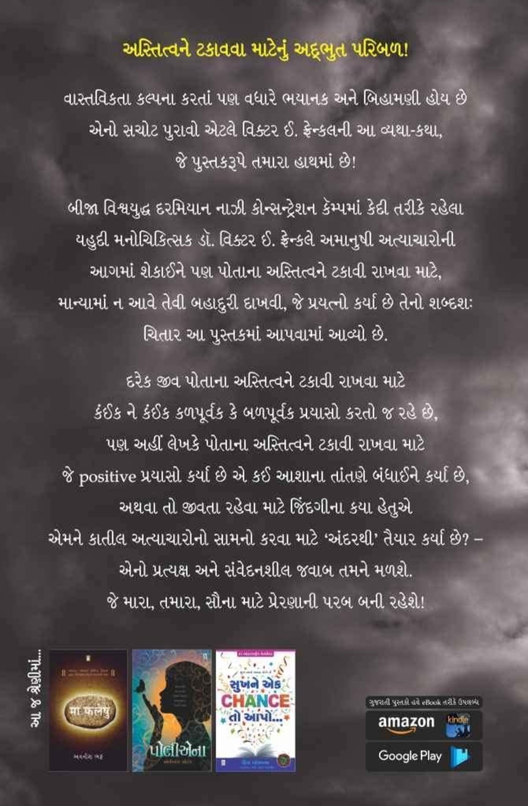 અસ્તિત્વને ટકાવવા માટેનું અદ્ભુત પરિબળ! વાસ્તવિકતા કલ્પના કરતાં પણ વધારે ભયાનક અને બિહામણી હોય છે એનો સચોટ પુરાવો એટલે વિક્ટર ઈ. ફ્રેન્કલની આ વ્યથા-કથા, જે પુસ્તકરૂપે તમારા હાથમાં છે! બીજા વિશ્વયુદ્ધ દરમિયાન નાઝી કોન્સન્ટ્રેશન કૅમ્પમાં કેદી તરીકે રહેલા યહુદી મનોચિકિત્સક ડૉ. વિક્ટર ઈ. ફ્રેન્કલે અમાનુષી અત્યાચારોની આગમાં શેકાઈને પણ પોતાના અસ્તિત્વને ટકાવી રાખવા માટે, માન્યામાં ન આવે તેવી બહાદુરી દાખવી, જે પ્રયત્નો કર્યા છે તેનો શબ્દશઃ ચિતાર આ પુસ્તકમાં આપવામાં આવ્યો છે. દરેક જીવ પોતાના અસ્તિત્વને ટકાવી રાખવા માટે કંઈક ને કંઈક કળપૂર્વક કે બળપૂર્વક પ્રયાસો કરતો જ રહે છે, પણ અહીં લેખકે પોતાના અસ્તિત્વને ટકાવી રાખવા માટે જે positive પ્રયાસો કર્યા છે એ કઈ આશાના તાંતણે બંધાઈને કર્યા છે, અથવા તો જીવતા રહેવા માટે જિંદગીના કયા હેતુએ એમને કાતીલ અત્યાચારોનો સામનો કરવા માટે `અંદરથી’ તૈયાર કર્યા છે? - એનો પ્રત્યક્ષ અને સંવેદનશીલ જવાબ તમને મળશે. જે મારા, તમારા, સૌના માટે પ્રેરણાની પરબ બની રહેશે!