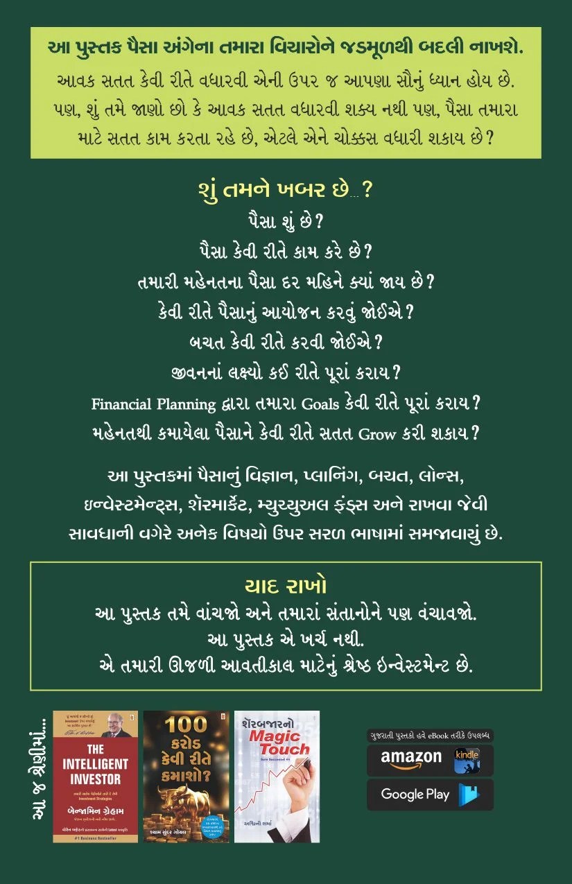 આ પુસ્તકમાં પૈસાનું વિજ્ઞાન, પ્લાનિંગ, બચત, લોન્સ, ઇન્વેસ્ટમેન્ટ્સ, શૅરમાર્કેટ, મ્યુચ્યુઅલ ફંડ્સ અને રાખવા જેવી સાવધાની વગેરે અનેક વિષયો ઉપર સરળ ભાષામાં સમજાવાયું છે.