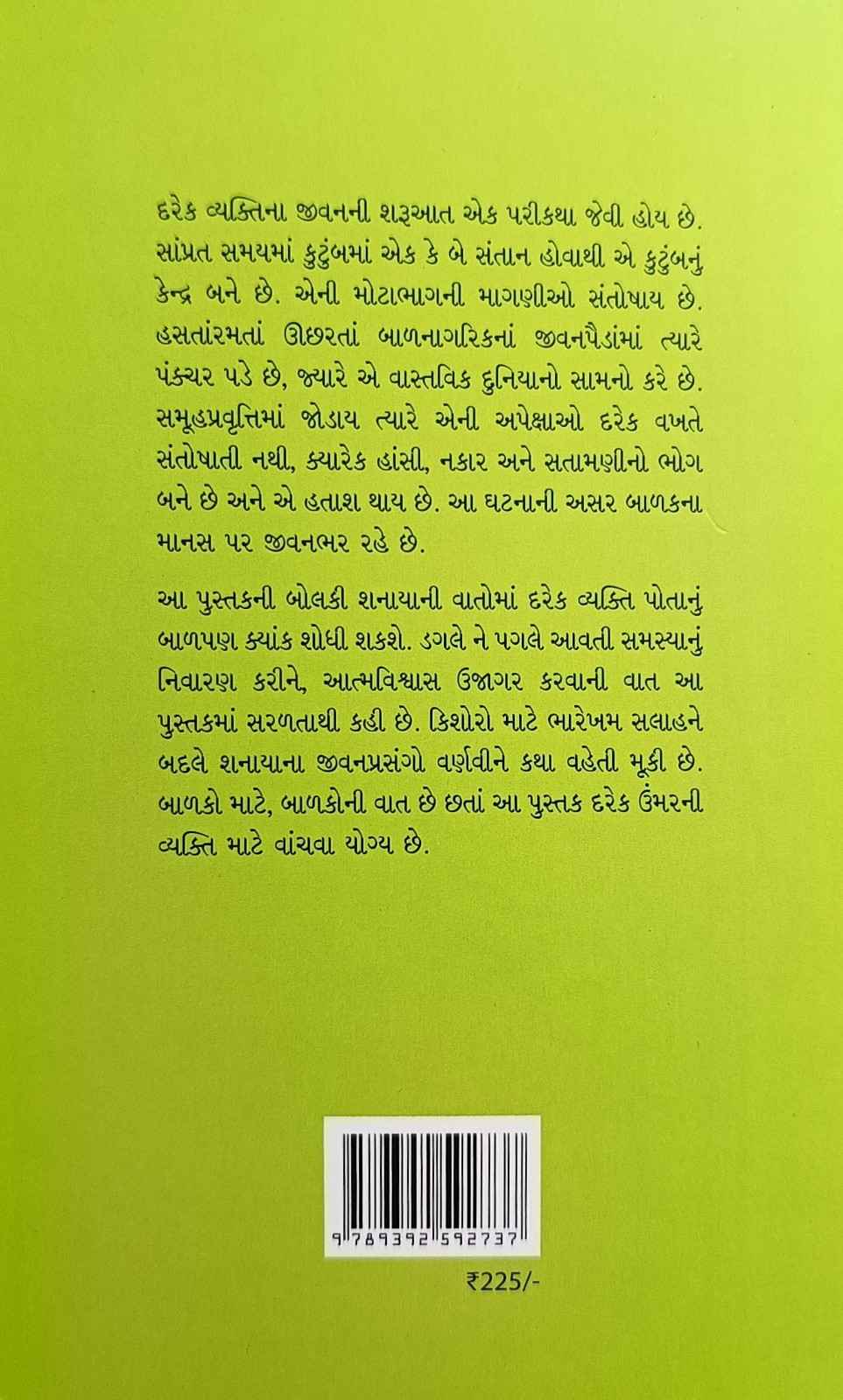 દરેક વ્યક્તિના જીવનની શરૂઆત એક પરીકથા જેવી હોય છે. સાંપ્રત સમયમાં કુટુંબમાં એક કે બે સંતાન હોવાથી એ કુટુંબનું કેન્દ્ર બને છે. એની મોટાભાગની માંગણીઓ સંતોષાય છે. હસતાંરમતાં ઊછરતાં બાળનાગરિકનાં જીવનપૈડાંમાં ત્યારે પંક્ચર પડે છે, જ્યારે એ વાસ્તવિક દુનિયાનો સામનો કરે છે. સમૂહ પ્રવૃત્તિમાં જોડાય ત્યારે એની અપેક્ષાઓ દરેક વખતે સંતોષાતી નથી, ક્યારેક હાંસી, નકાર અને સતામણીનો ભોગ બને છે અને એ હતાશ થાય છે. આ ઘટનાની અસર બાળકના માનસ પર જીવનભર રહે છે. આ પુસ્તકની બોલકી શનાયાની વાતોમાં દરેક વ્યક્તિ પોતાનું બાળપણ શોધી શકશે. ડગલે ને પગલે આવતી સમસ્યાનું નિવારણ કરીને, આત્મવિશ્વાસ ઉજાગર કરવાની વાત આ પુસ્તકમાં સરળતાથી કહી છે. કિશોરો માટે ભારેખમ સલાહને બદલે શનાયાના જીવનપ્રસંગો વર્ણવીને એક માર્ગદર્શિકા બનાવી છે. આ કિશોરકથા દરેક ઉંમરની વ્યક્તિ માટે વાંચવા યોગ્ય છે.
